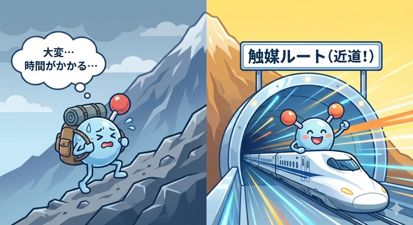 化学反応が起きるには、高い山(エネルギーの壁)を越えなければなりません。自力で登るのは大変ですが、触媒は「トンネル(近道)」を掘ってくれます。
