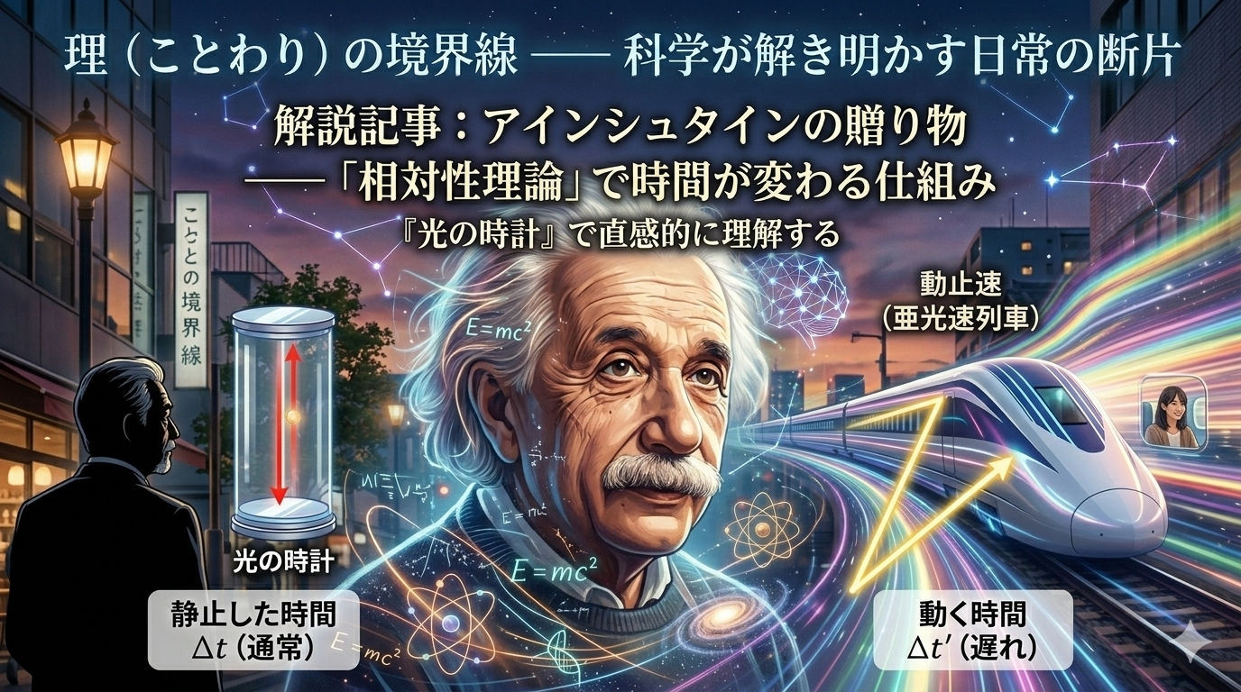「時間は誰にとっても平等に、1秒、2秒と刻まれるもの」という私たちの常識を、アインシュタインは「特殊相対性理論」で根底から覆しました。なぜ、速く動くものほど時間はゆっくり流れるのか?そのナゾを解く鍵は、アインシュタインが考えた特別な時計にあります。