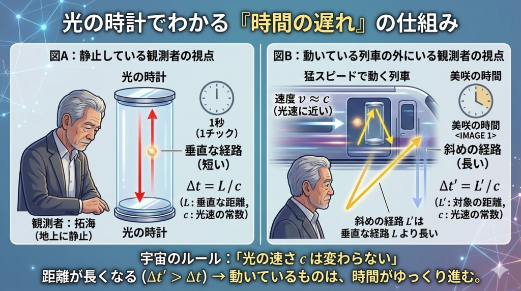斜めの線は、垂直な線よりも長いですよね?「同じ速さ」で「より長い距離」を走るなら、当然、到着までに「より長い時間」がかかります。つまり、外で見ている拓海にとって、動いている美咲の「1秒」は、自分よりも間延びして、ゆっくり流れていることになるのです。