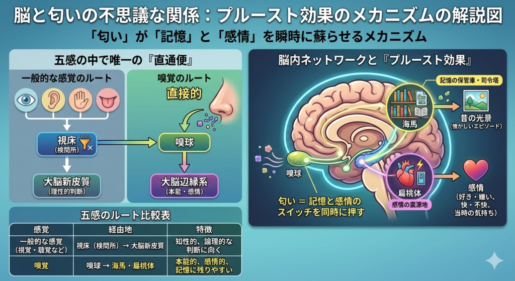 この「直通便」こそが、匂いが理屈抜きに感情を揺さぶる最大の理由です。
